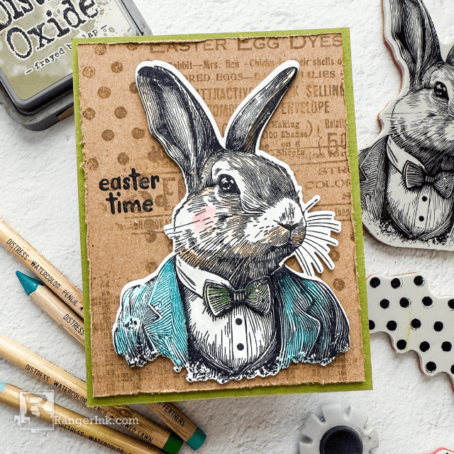 Hop into Easter with this dapper bunny! In this tutorial, Cheiron Brandon creates this charming card using the Tim Holtz Stampers Anonymous Mr. Rabbit Stamp, colored beautifully with Distress Watercolor Pencils. The textured background, featuring Distress Oxide adds the perfect vintage touch.