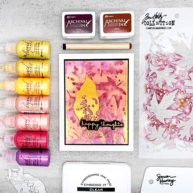 Step 5: Spread Marigold Liquid Pearls over a Wendy Vecchi Perfect Cardstock White Panel using the Scraper from the Simon Hurley Create Paste Tool Set. Reapply as needed to achieve desired coverage. Die cut Tim Holtz Sizzix Thinlets Die Set Leaf Fragments leaf from Marigold panel.