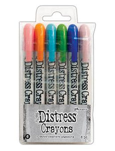 Distress Crayons are formulated to achieve vibrant coloring effects on porous surfaces for mixed-media. The smooth water-reactive pigments are ideal for creating brilliant backgrounds, watercoloring, smudge effects and more! Color directly onto your surface and blend with water then layer with Distress Inks or Stains for more creative possibilities. Available in 10 sets that coordinate with the Distress Palette.