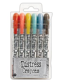 Distress Crayons are formulated to achieve vibrant coloring effects on porous surfaces for mixed-media. The smooth water-reactive pigments are ideal for creating brilliant backgrounds, watercoloring, smudge effects and more! Color directly onto your surface and blend with water then layer with Distress Inks or Stains for more creative possibilities. Available in 10 sets that coordinate with the Distress Palette.