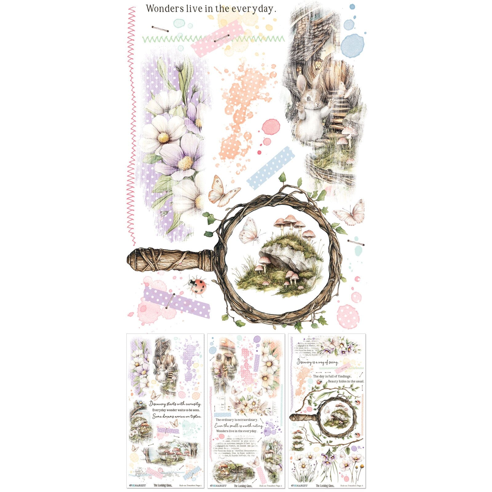 Transform any project into a vintage heirloom with The Looking Glass Rub-on Transfer Set. Curated by Joanne Bain, these high-quality transfers allow you to add "impossible" details with ease. Imagine delicate stitching that looks sewn into the page, distressed scenery that fades into your background, and ethereal word art that looks professionally typeset onto your work.