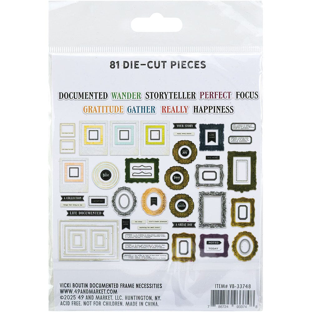 Unleash your creativity with Vicki Boutin's Documented Frame Necessities pack! This must-have, versatile pack is brimming with an assortment of beautifully designed frames, handy pockets, and charming labels. Perfect for scrapbooks, journals, cards, and mixed media, these elements offer endless possibilities for showcasing your photos, adding hidden journaling, and creating captivating visual interest on all your paper crafting projects.