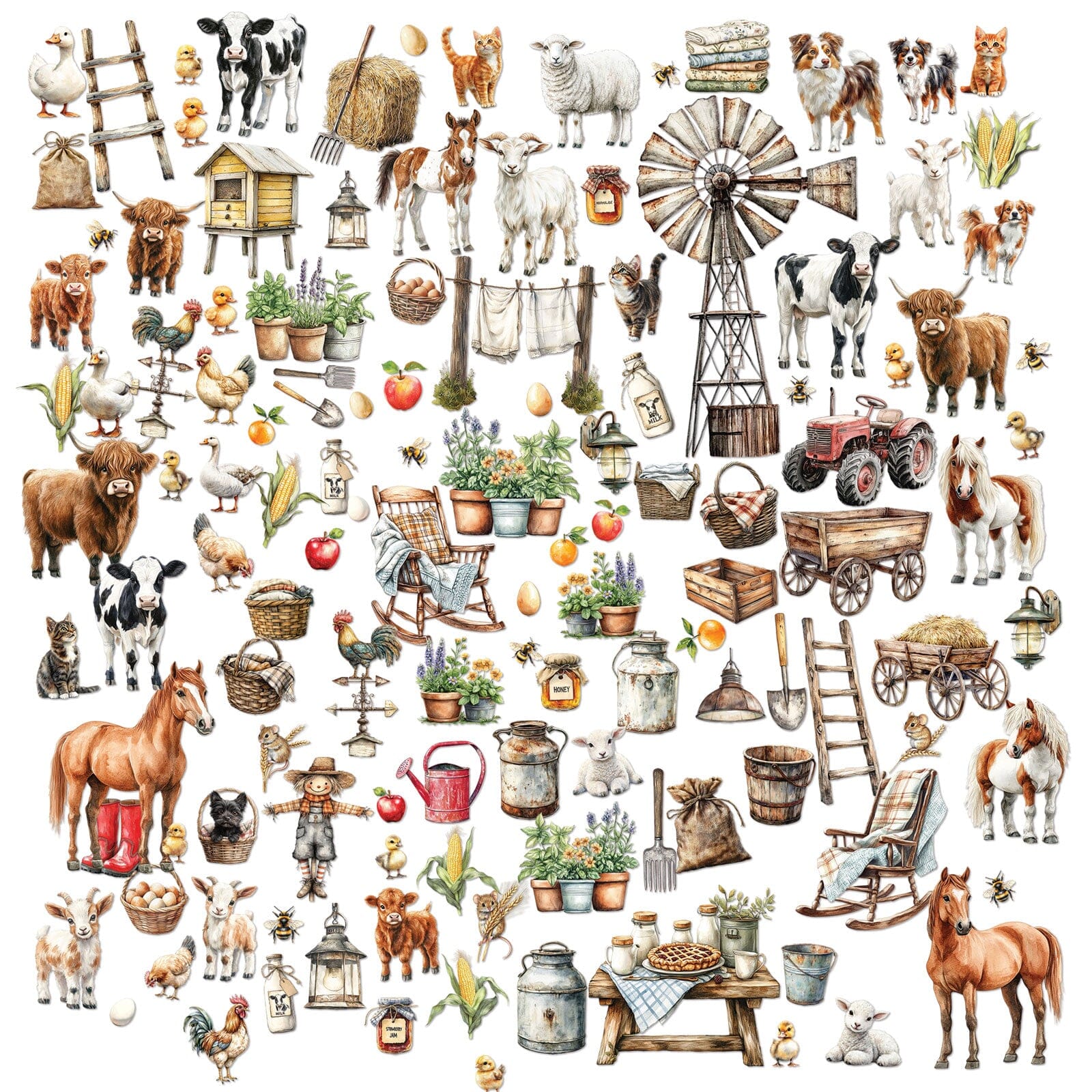 Step into the serene world of the countryside with Joanne Bain’s whispering way laser cut elements from 49 and Market. Created for farm folks and anyone who loves rustic charm, this collection captures the heart of rural life with beautifully detailed pieces. You’ll find an adorable mix of animals, a tall windmill, fresh greenery, and classic farm icons like a rolling wheelbarrow, a sturdy tractor, and a graceful weathervane. Perfect for adding a wholesome farmhouse feel to scrapbooks, cards, journals, and mixed media projects. Includes 127 pieces.