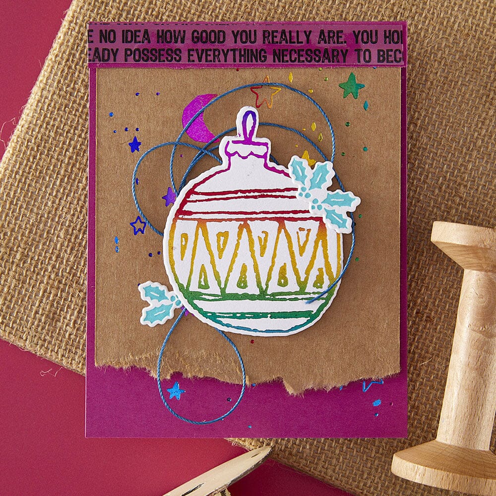 Merry, Merry, Merry Bird Registration Press Plate & Die Set is from the Starry Holiday Collection by Dina Wakley. The set of five press plates, three thin metal cutting dies, and one mylar printed registration template come together to create a sketched-style sweet bird perched on a holiday ornament with a sentiment against the dotted backdrop. Use the registration template to make a card with all the plates, or use each plate on it's own for endless style choices. The best part? Many of the plates can be used all year long! The full design measures approximately 4.11 x 4.75 in./10.40 x 12.10 cm.